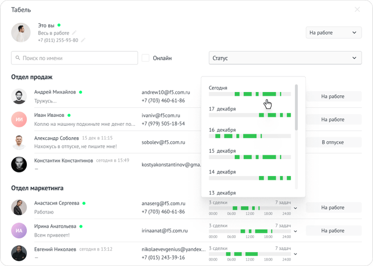 Установка рабочего статуса: Сотрудник может самостоятельно выбрать свой актуальный статус (например, "Работаю", "Обед", "Совещание", "Больничный", "Отпуск").